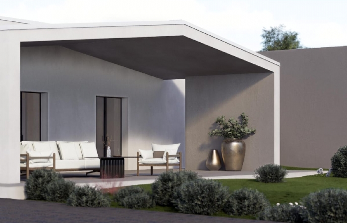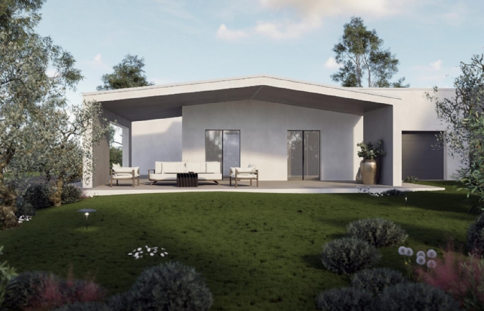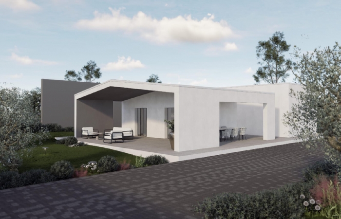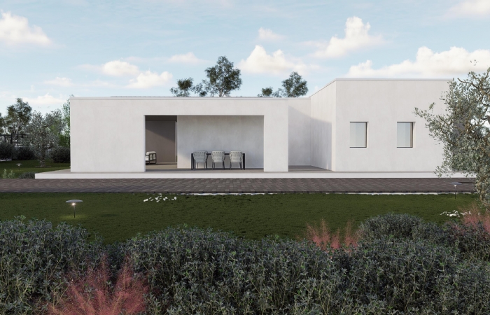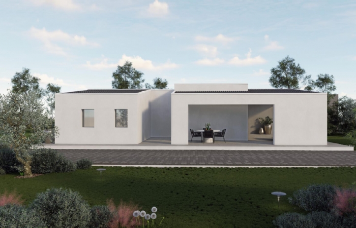 La villa sviluppata completamente al piano terra, offre una superficie residenziale ben sviluppata, composta da: ingresso su open space con cucina a vista, camera matrimoniale, due camerette, bagno padronale, doppio servizio, portico e locale tecnico.